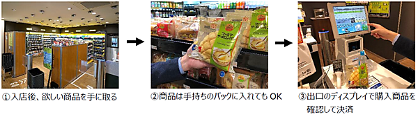 店舗面積は約41平方メートル、取扱品目は約800種類。営業時間は7時から20時。支払方法は、「ファミペイ」を含めたバーコード決済、交通系電子マネー、クレジットカード、現金に対応する。天井に設置したカメラなどの情報から入店した顧客と手に取った商品をリアルタイムに認識。出口付近に設置した決済端末のディスプレイに購入商品と合計金額が自動で表示され、バーコード決済などでスピーディーに買い物ができる。