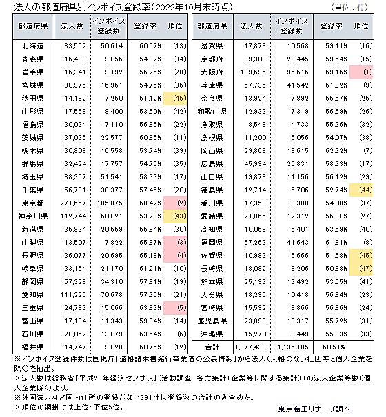 - 【調査対象】国税庁「適格請求書発行事業者の公表情報」の法人および個人企業の登録情報(2022年10月末)