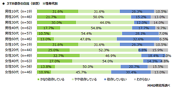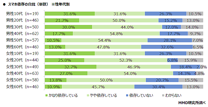 性年代別で見ると、「かなり依存している」は10~40代、「やや依存している」は20~50代が多い。なお「かなり依存している」は女性30代32.7%が最多、「依存していない」は男性60代32.6%がそれぞれ最多だった。