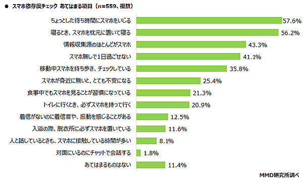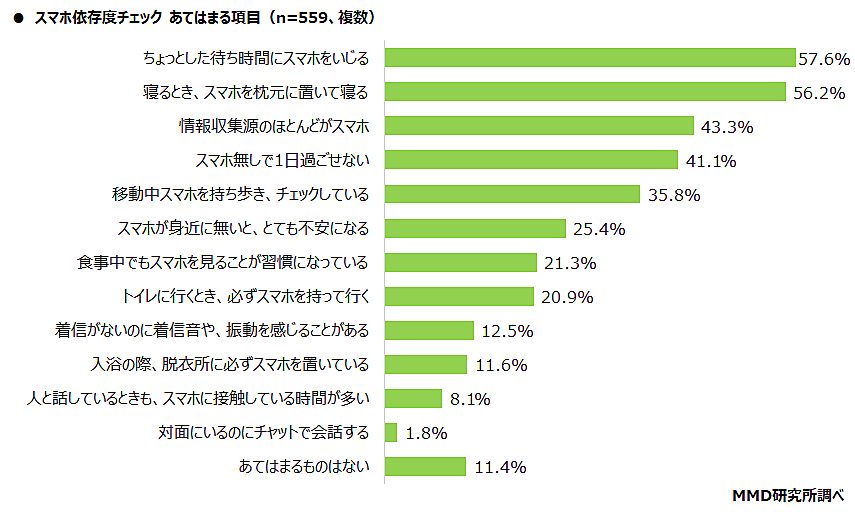 「スマホ依存症の特徴」である12項目についてあてはまるもの(複数選択可)を聞くと、「ちょっとした待ち時間にスマホをいじる」57.6%、「寝るとき、スマホを枕元に置いて寝る」56.2%、「情報収集源のほとんどがスマホ」43.3%が上位だった。