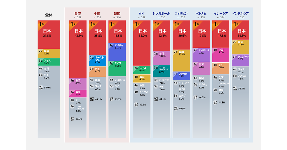 まず、近い将来最も行きたい国を聞くと、日本以外の9カ国・地域全てにおいて日本が1位という結果になった。
