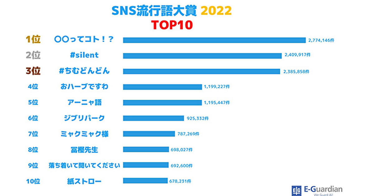 セキュリティ企業のイー・ガーディアンは、「SNS流行語大賞2022」を発表した。2022年(2022年1月1日~11月7日)にTwitter上で頻繁に使用された(バズった)フレーズを独自集計したもので、2022年で3回目。大賞のほか、「ゲーム」「漫画・アニメ」「テレビ・映画」「食べ物・モノ」の各部門賞も発表されている。