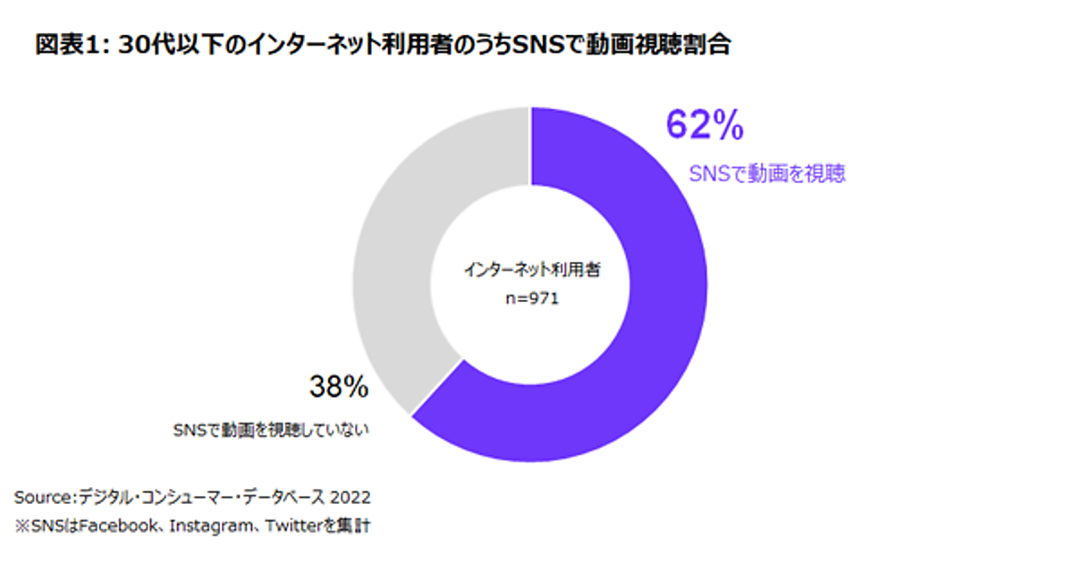 近年ショート動画や動画広告の普及もあり、SNSでの動画視聴機会が増えている。「主要SNS上で動画を視聴しているか」を聞くと、全体の40%が「SNSで動画視聴している」と回答しており、さらに30代以下にしぼると62%まで上昇する。