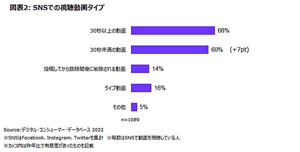 また「SNSで視聴する動画のタイプ」を聞くと、「30秒以上の動画」が66%で最多だったが、「30秒未満の短編の動画」も前年から増加しており、逆転の可能性が出ている。なお短編動画を視聴する人ほどSNS内のおすすめ機能を活用する割合が低かったという。
