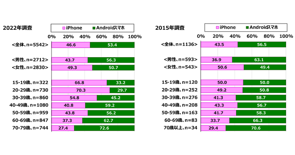 まず、性別・年代別にiPhone-Androidスマホ比率を調べ、2015年調査と比較すると、全体的に若い世代のiPhone比率が高まっていることが分かった。10代では66.8%、20代では70.3%がiPhoneを使用している。一方で、70代では70.6%がAndroidスマホユーザーであった。男女別でみると、2015年調査では女性のiPhoneユーザーの割合が男性よりも13.7ポイント高かったが、今回の調査では5.5ポイントに縮まった。