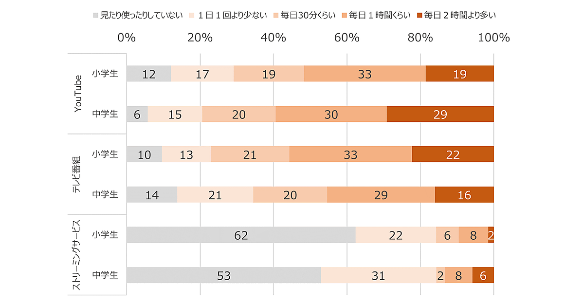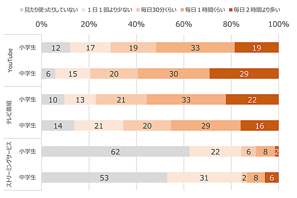 まず小中学生に「動画の視聴頻度」を聞くと、「まったく見ていない・使っていない」という子どもは「YouTube」「テレビ番組」ともに1割前後。「ストリーミングサービス」は小学生で約6割、中学生で約5割だった。逆に「毎日2時間以上視聴」という子どもは「YouTube」「テレビ番組」ともに2割程度存在し、とくに中学生のYouTube視聴では29%にまで達している。