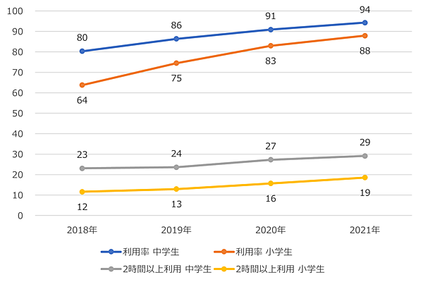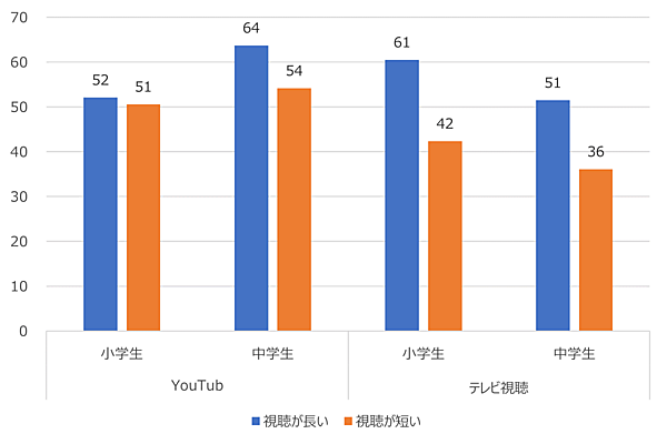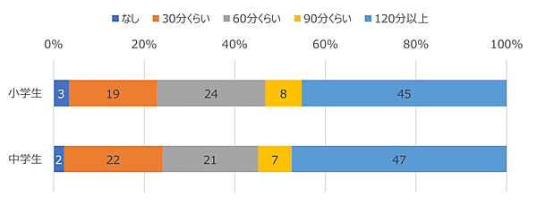 これを「動画の視聴時間」で見ると、小中学生とも5割近くが毎日なんらかの動画を2時間以上視聴していた。特に中学生について見ると、視聴時間が短い層と長い層に二極化しつつある様子がうかがえる。