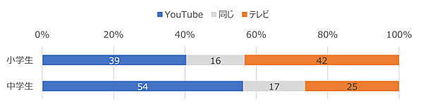 「YouTubeとテレビ番組を比較し、どちらをよく見ているか」を集計すると、小学生はテレビ視聴がわずかに多め、中学生はYouTubeが大きく増加する。