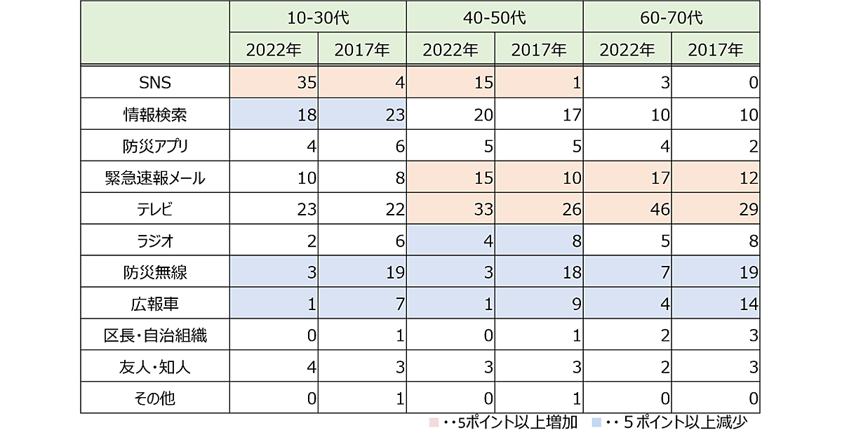 この5年間で情報取得方法にどのような変化が見られたかを年代別にみると、上図のようになった。10~30代では「SNS」が31ポイント増え、その分「防災無線」が大きく減っている。40~50代でも似たような変化が見られた。一方で60~70代では、「テレビ」が17ポイント増加しており、その分「防災無線」「広報車」が減っていた。