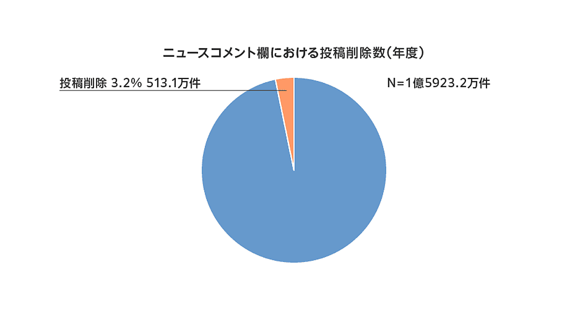 1カ月平均でみると、Yahoo!ニュースコメントは1326.9万件の投稿のうち3.22%にあたる約42.8万件を不適切として削除した。前年度は3.3%、35万件だった。Yahoo!知恵袋は474.7万件の投稿があり、削除は4.4%の20.8万件。前年度は5.1%、23万件。Yahoo!ファイナンス掲示板は、投稿数231.1万件で、削除件数は9.3万件、4.0%となった。