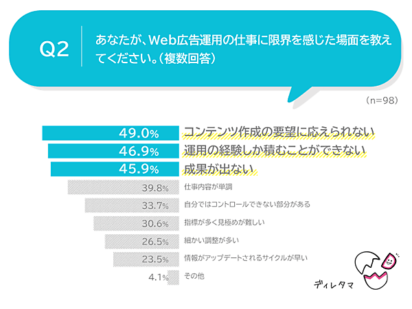 具体的に「Web広告運用の仕事に限界を感じた場面」(複数回答)を「ある」と回答した98人に聞くと、「コンテンツ作成の要望に応えられない」49.0%、「運用の経験しか積むことができない」46.9%、「成果が出ない」45.9%の3つが上位となった。