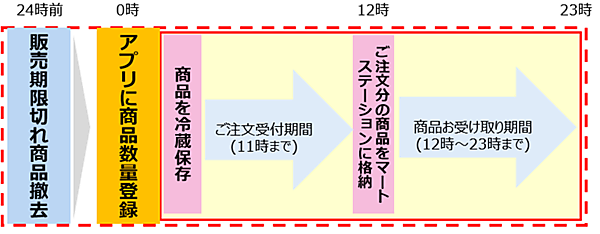「ナチュラルローソン芝浦海岸通店」(東京都港区)で消費期限内だが通常は店頭から撤去する販売期限切れのデザート10品を値引き販売する。販売期限を消費期限当日の午前0時にしている商品を撤去後、クックパッドマートの専用アプリに数量を登録して冷蔵保存。クックパッドマート会員から注文・決済が入ると店舗内に設置した生鮮宅配ボックス「マートステーション」に格納する。購入者はマートステーションで商品を受け取る。