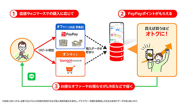 マイレージに参加するメーカーの対象商品を、オフラインの対象店舗ではPayPayのスマートフォン決済で、オンラインでは「Yahoo!ショッピング」の対象ストアで購入すると、商品の購入金額に応じてマイルが貯まる。購入した商品の購買情報をマイレージのサービス画面上で確認でき、マイルを貯めて「PayPayポイント」などの特典が受けられる。オフとオンの垣根を越えて、買えば買うほどお得に買い物ができる。