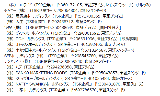 集計の対象企業・事業は、コロワイド、チムニー、鳥貴族HD、大庄、ワタミ、ヴィア・HD、DD HD、ヨシックスHD、串カツ田中HD、SFP HD、テンアライド、ハブ、SANKO MARKETING FOODS、ジェイグループHD、NATTY SWANKY HD、一家HDの16社。