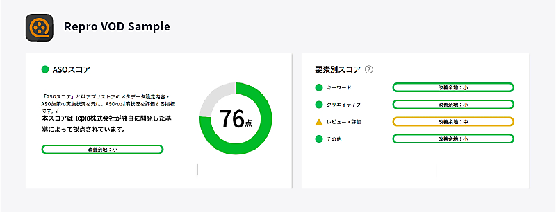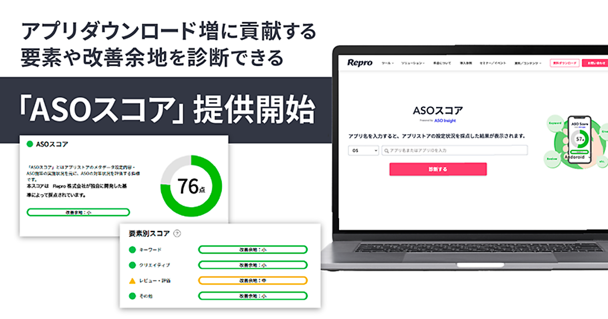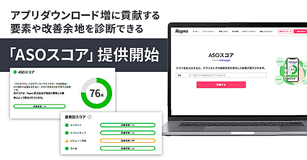 カスタマーエンゲージメント(CE、顧客とのつながり)事業のRepro(リプロ)は、ASO(アプリストア最適化)対策状況を無料で診断できる「ASOスコア」のサービス提供を12月15日から始めた、と同日発表した。診断によって、アプリストア経由の自然検索流入数の増加やアプリダウンロード数・率の改善余地を把握できる。ReproのASO支援ツール「ASO Insight」の一部機能を無料で提供した。