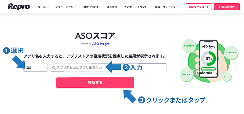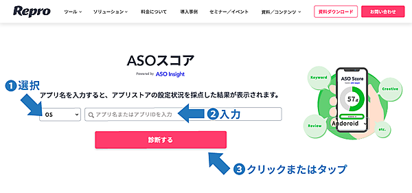 ASOは、アプリストア内のアプリ詳細ページの内容を最適化することでストア内検索での検索順位を上位表示させ、アプリ詳細ページへの流入数の増加やダウンロード数・率を向上させる施策。無料診断は、ASOスコアのWebページで、①「iOS」か「Android」を選択、②アプリ名かアプリIDを入力、③「診断する」をクリック(タップ)する。アプリストアでのメタデータ設定内容やASO施策の実施状況を独自開発した基準で評価・判定する。