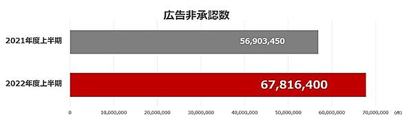 ヤフーは、2022年度上半期(2022年4月1日~9月30日)の広告審査実績をまとめた「広告サービス品質に関する透明性レポート」を公表した、と12月19日発表した。「Yahoo! JAPAN」が定めた基準に抵触するとして、6781万6400件の広告素材を非承認にした。2021年度上半期の5690万3450件から増加していた。非承認の理由では「医療機関」の割合が上昇した。