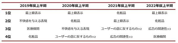 非承認の件数は、広告掲載基準、広告入稿規定、広告販売ルールに抵触した広告のタイトル、説明文、画像、リンク先サイト、キーワードの各非承認数の合計で、広告単体の件数ではない。非承認理由では毎年上位の「最上級表示」「化粧品」が1、2位だったが、今回は医療機関が4位に入った。医療機関は2021年度と2020年度の上半期には4位以内になかった。