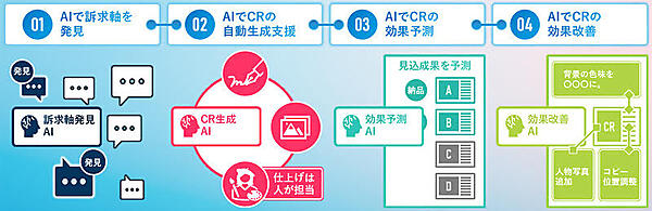 ①訴求軸発見②クリエイティブ生成③効果予測④改善サジェスト--の各AIがサポート。①が訴求ワードを複数抽出して気付けなかったポイントを発見し、②がクリエイティブに使うコピーを自動生成。③でクリエイティブの構成要素とさまざまな指標の関係性を学習させたAIが改善の効果を予測。④で改善対象のクリエイティブを特定して改善案を提案する。