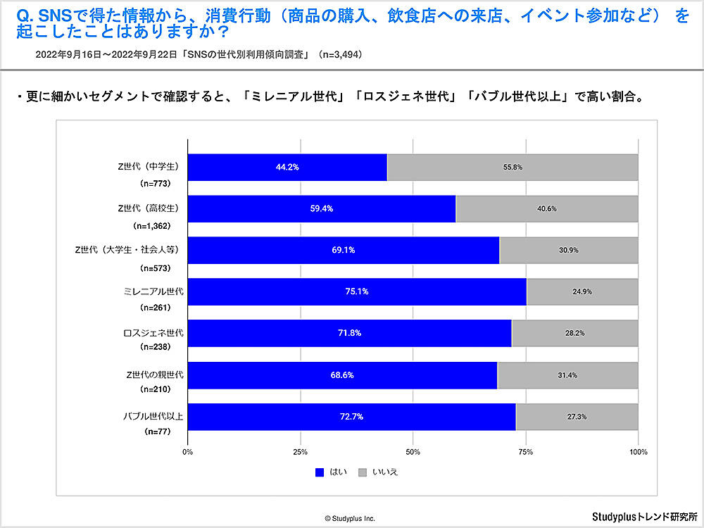 まず「SNSで得た情報から、消費行動を起こしたことはありますか?」と聞くと、Z世代が57.1%だったのに対しX・Y世代は72.1%でかなり上回る。特にいわゆる「ミレニアル世代」が高い。