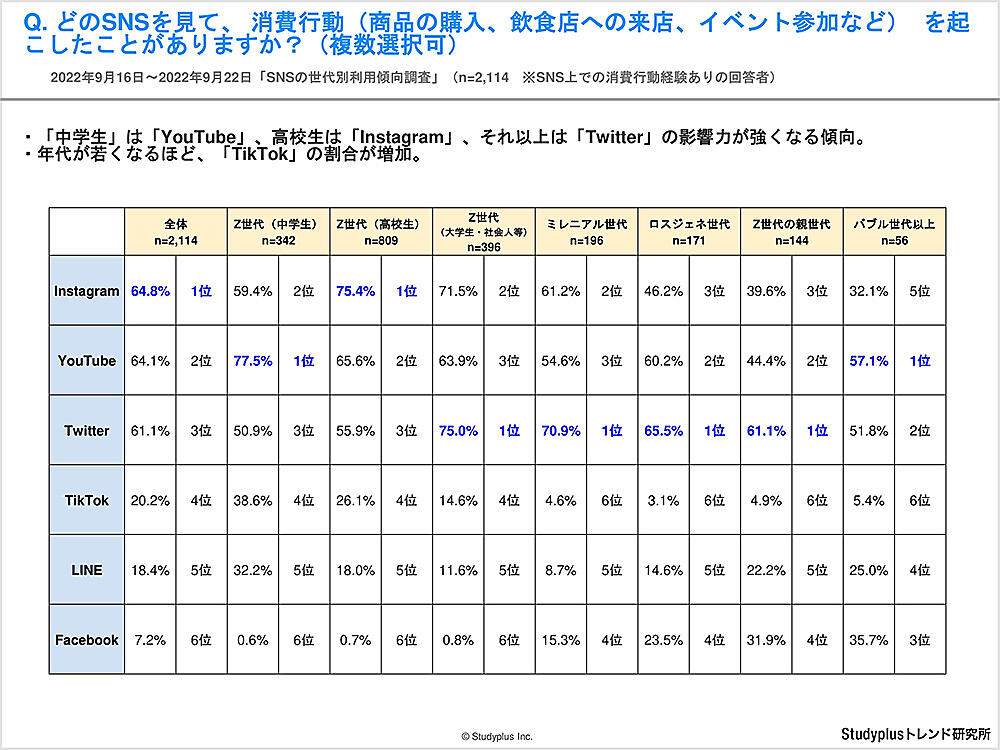 次に「どのSNSを見て、消費行動を起こしたことがありますか?」と聞くと、Z世代は「YouTube」77.5%、X・Y世代では「Twitter」64.9%が最多だった。さらに詳細を見ると、中学生は「YouTube」、高校生は「Instagram」、それ以上は「Twitter」が影響を与えていた。また若年層ほど「TikTok」の影響も大きい。