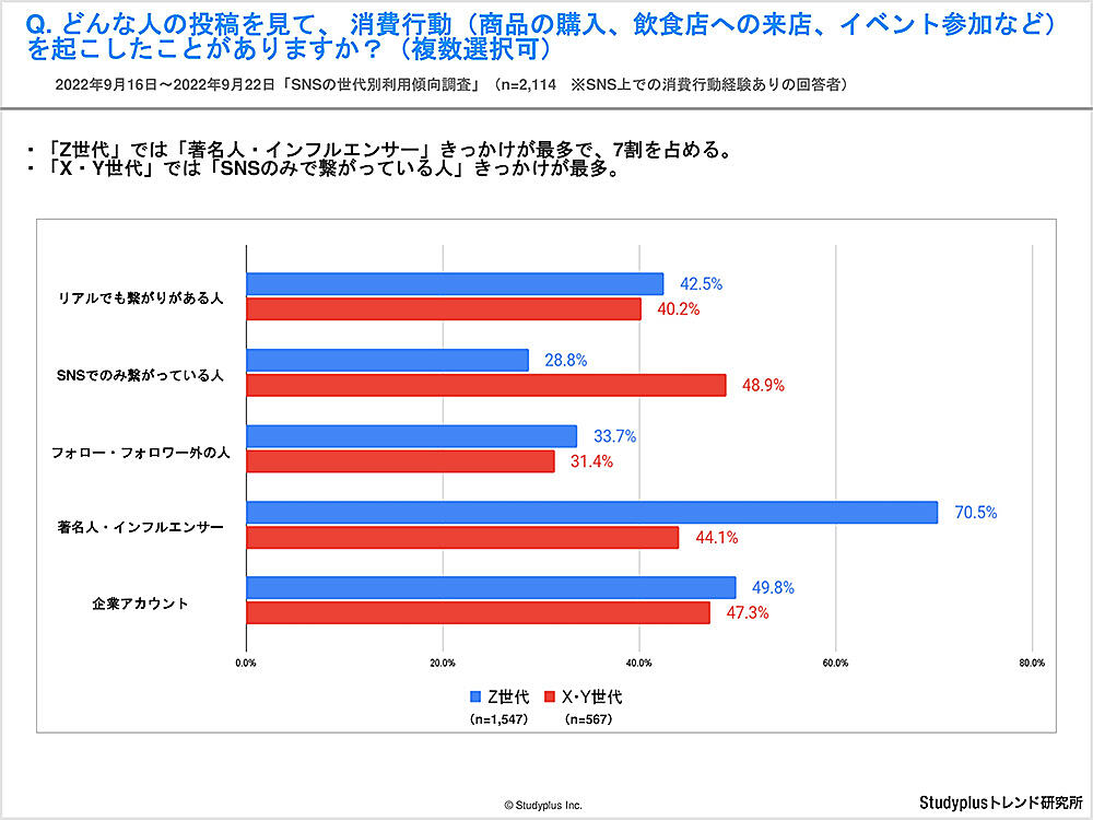 さらに「どんな人の投稿を見て、消費行動を起こしたことがありますか?」という質問では、Z世代は「著名人・インフルエンサー」が7割超、X・Y世代は「SNSのみで繋がっている人」が最も多い。細かい年代別では、ミレニアル世代で「企業アカウント」が最多になるといった傾向差も見られた。