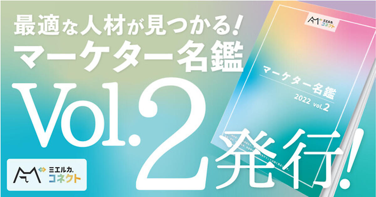 人材不足に悩んでいたり外部人材の活用を考えていたりする企業向け。10月に発行した「マーケター名鑑vol1」に続いて提供する。マーケター名鑑は、ミエルカコネクトに登録している800人のマーケターの中から、同社が紹介したい人材をまとめた冊子で、定期的に発行する。vol1は14人、vol2は11人を取り上げている。