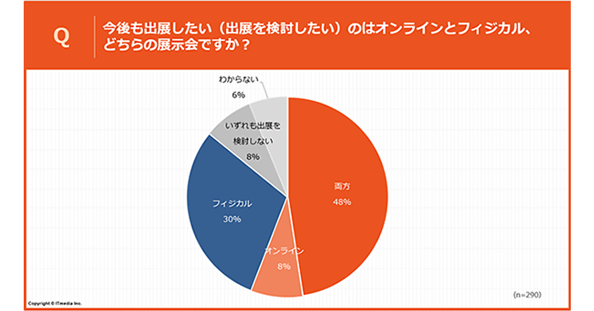 行動制限解除の流れからフィジカル(オフライン)展示会開催も戻りつつあるが、「今後も出展したい(出展を検討したい)のはオンラインとフィジカルどちらの展示会か」を聞くと、「フィジカル」30%、「オンライン」8%、「両方」48%となり、半数以上がオンライン開催も指向している。