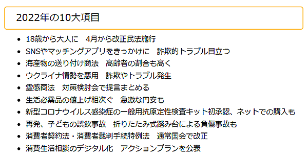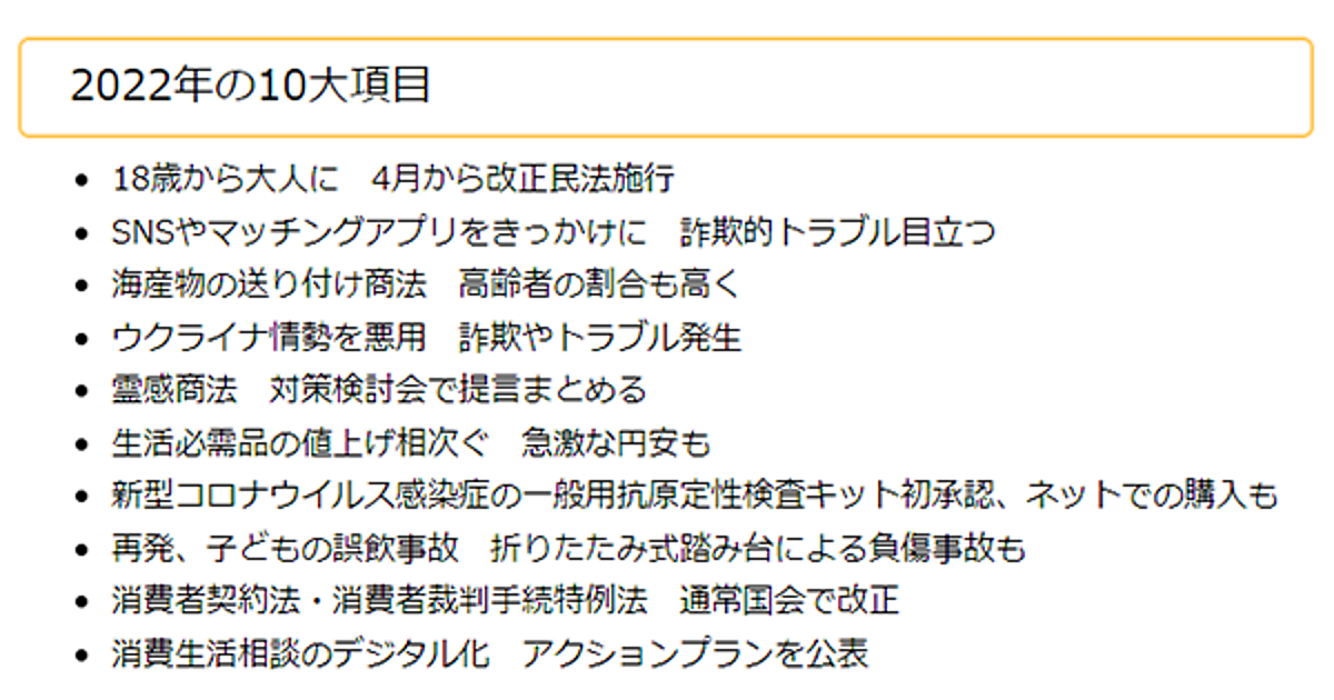 それによると、「消費者問題に関する2022年の10大項目」は、以下の10項目だった。2022年は、改正民法の施行による成年年齢の引き下げ、SNSやマッチングアプリをきっかけとしたトラブル、霊感商法への対応強化などに注目が集まったという。