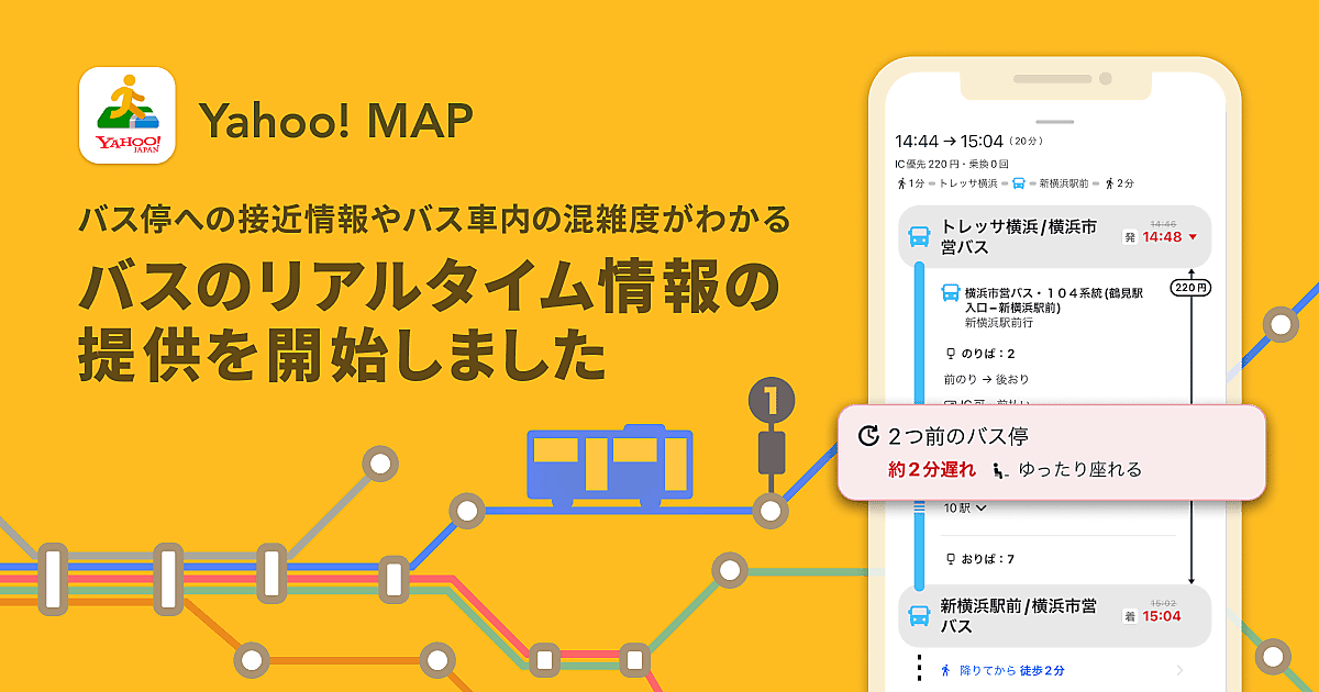 ヤフーは、同社が展開する地図サービス「Yahoo! MAP」(「iOS」「Android」版)で、「バスのリアルタイム情報」機能の提供を12月21日に始めた、と同日発表した。バスのルート検索結果画面でバス停への「接近情報」、バスの「遅延情報」、バス車内の「混雑情報」が分かる。バスの利用に関する機能を拡充することでバスでの移動をより快適にする。