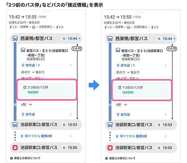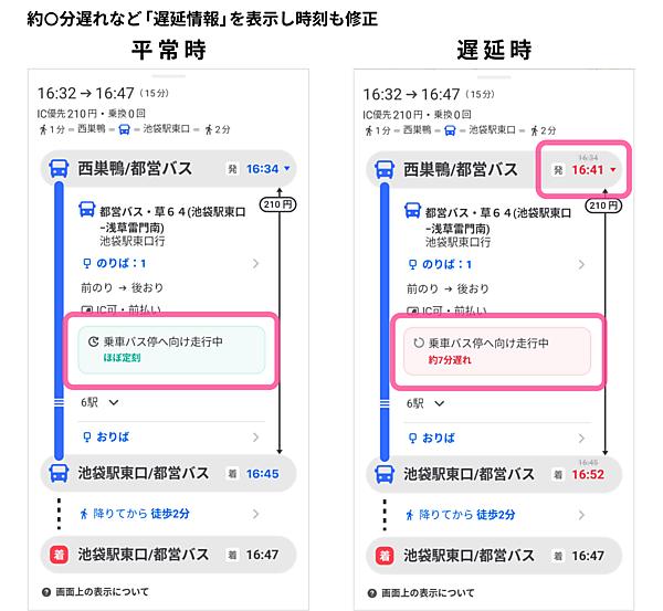 接近情報は、バス経路を検索してルート検索を開くと「運行開始前」「乗車バス停へ向け走行中」「2つ前のバス停」「1つ前のバス停」「乗車バス停を出発済」などを表示。情報は随時更新する。遅延情報は、ルート詳細画面でバスの平常運転時には「ほぼ定刻」、遅延が発生していると「約○分遅れ」と示し、地図上のバス乗り場・降り場にも反映する。