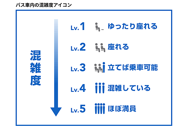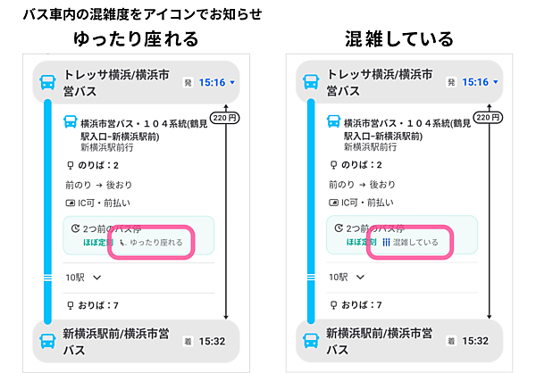 混雑情報は「ゆったり座れる」「座れる」「立てば乗車可能」「混雑している」「ほぼ満員」の5段階で表示。状況に合わせて乗るバスが選択できる。Yahoo! MAPはこれまで、バスの位置・名称、出発時間を地図上で確認できる機能や、バスの乗り方・降り方、運賃の支払い方法などの情報を提供してきた。バスのリアルタイム情報でさらに便利になった。
