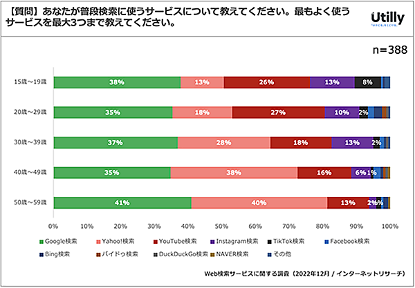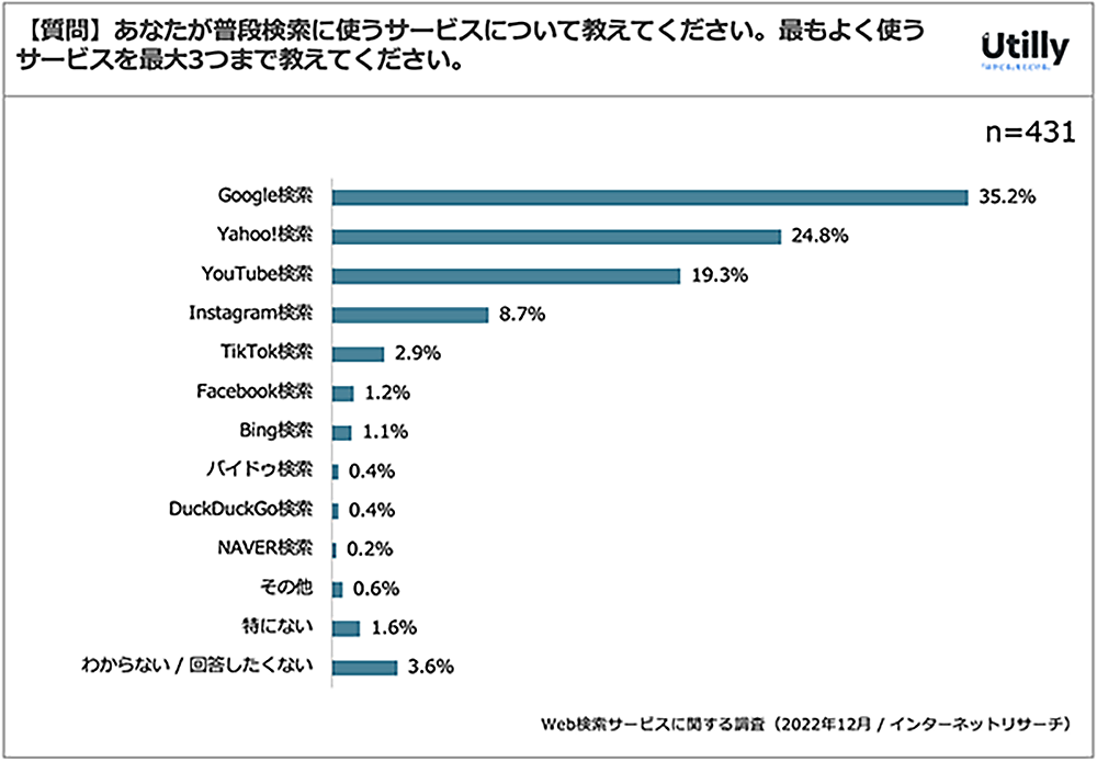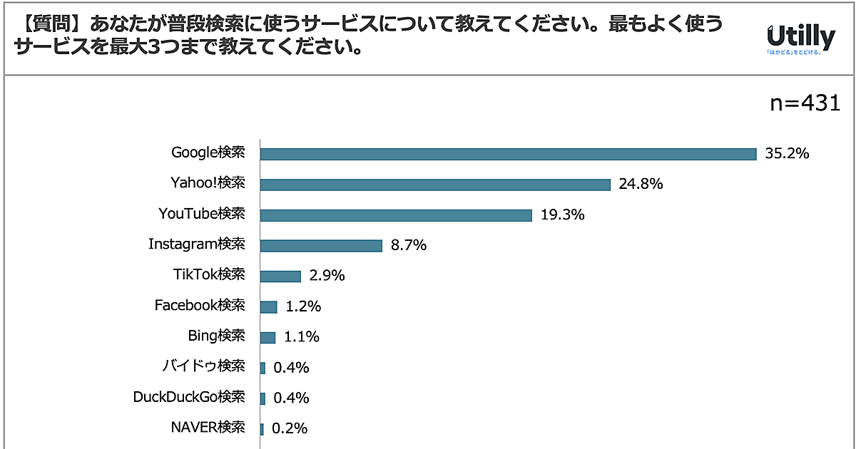 GO TO MARKETが運営する「Utilly」(ユーティリー)は、「Web検索サービスの利用習慣」に関する調査結果を発表した。15歳以上60歳未満の男女431人が回答している。