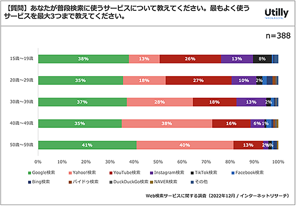 まず「ふだん使っているWeb検索(ネット検索)のサービス」を聞くと(選択式で最大3つまで)、やはり最多は「Google検索」35.2%で、2位は「Yahoo!検索」24.8%だった。いわゆる検索サービスがトップ2を占めたが、3位以下は「YouTube検索」19.3%、「Instagram検索」8.7%、「TikTok検索」2.9%とSNSサービスが続いた。