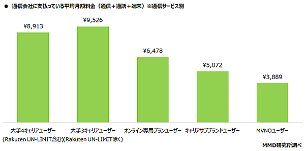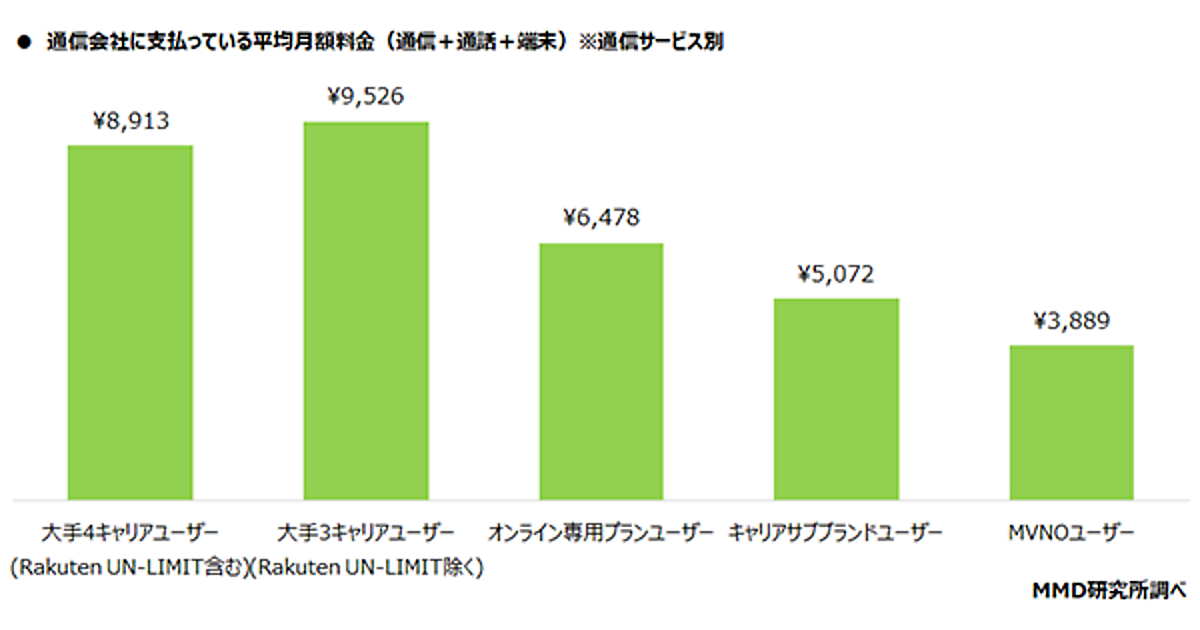 月額料金(通信+通話+端末)平均は、大手4キャリアだと「8,913円」