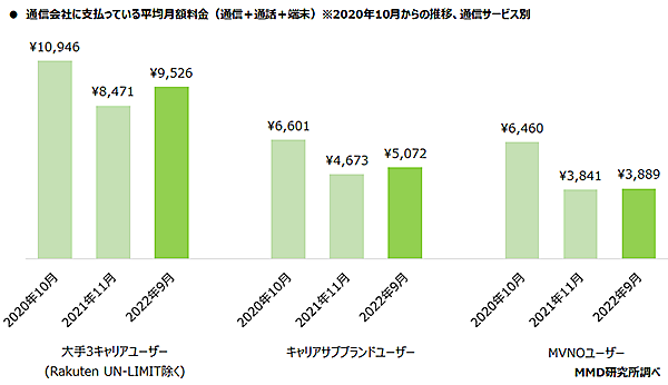 ここ2年の推移を見ると前年2021年に最低値を迎え、2022年は2021年との比較で、大手3キャリアユーザー(Rakuten UN-LIMITを除く)は1,055円増、キャリアサブブランドユーザーは400円増、MVNOユーザーは48円増と、いずれも増加している。