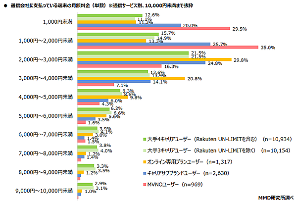 「支払っている月額料金(通信+通話+端末)」について聞くと、平均月額料金は大手4キャリアユーザーの場合「8,913円」、Rakuten UN-LIMITを除くを除いた大手3キャリアユーザーは「9,526円」だった。さらにオンライン専用プランユーザーのみで見ると「6,478円」、キャリアサブブランドユーザーは「5,072円」、MVNOユーザーは「3,889円」と、ほぼ1,000円単位の幅で棲み分けがされている。
