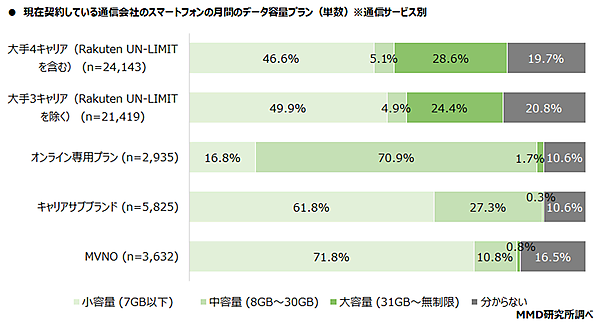 「契約している月間のデータ容量プラン」を聞くと、大手4キャリア(n=24,143)は「小容量(1GB以下~7GB)」46.6%、大手3キャリア(n=21,419)は「小容量(1GB以下~7GB)」49.9%が最多だった。