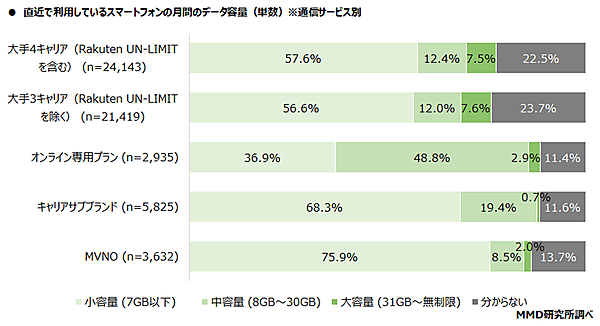 一方「直近で利用した月間のデータ容量」についても、大手4キャリアは「小容量(1GB以下~7GB)」57.6%、大手3キャリア(Rakuten UN-LIMITを除く)は「小容量(1GB以下~7GB)」56.6%が最多だった。
