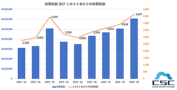 2022年第3四半期(7月1日~9月30日)に検知された“Webアプリケーションへのサイバー攻撃”の総数は1億5,818万1,684件だった。これは1秒間に20回程度のサイバー攻撃を検知していることとなる。また1ホスト当たりの攻撃数は7月度3,644件、8月度3,918件、9月度4,637件と増加を見せている。