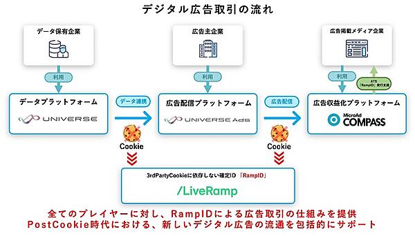 マイクロアドは、約210の提携企業から消費者のライフスタイルデータを収集・集約したUNIVERSEと広告配信のUNIVERSE Ads、メディア企業の広告収益化プラットフォーム「MicroAd COMPASS」を展開。MicroAd COMPASSは22年1月からRampIDと連携済みなので、デジタル広告に関連する広告主、メディア企業、データ保有企業の全てのプレイヤーに同時にRampIDのソリューションを提供するアジアで初の単一企業になった。