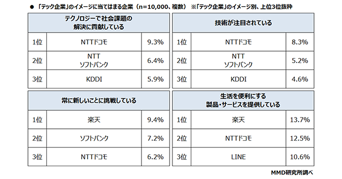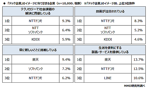MMD研究所は、「2022年消費者が思うテック企業イメージ調査」の結果を発表した。「IT企業」(テック企業)と聞いて純粋想起する企業を事前調査して上位19位までを選択肢とし、消費者10,000人が回答している。