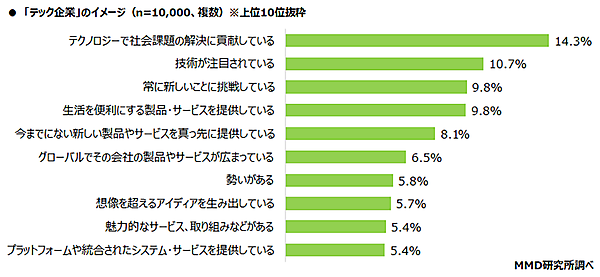 次に「テック企業のイメージ」を聞くと、「テクノロジーで社会課題の解決に貢献している」14.3%が最多で、「技術が注目されている」10.7%、「常に新しいことに挑戦している」「生活を便利にする製品・サービスを提供している」各9.8%だった。