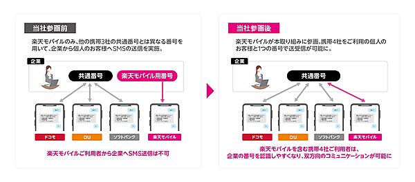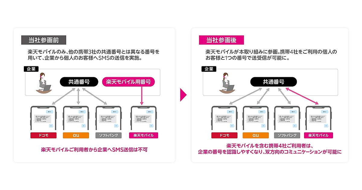 共通番号は、携帯3社が企業に提供する10桁以下の数字列。SMSは携帯電話番号だけでテキストメッセージを送信できるので、二段階認証のコード送付など主に企業から個人への片方向の連絡手段に利用される。これまで楽天モバイルは携帯3社の共通番号と異なる番号で企業のSMSを送信し、楽天モバイルユーザーから企業へのSMS送信もできなかった。