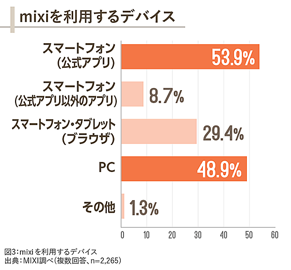 「mixiを利用するデバイス(複数回答)」では、「スマートフォン(公式アプリ)」53.9%と「PC」48.9%がほぼ並ぶ。スマホメインの時代になっても比較的PC利用者が多い印象だ。