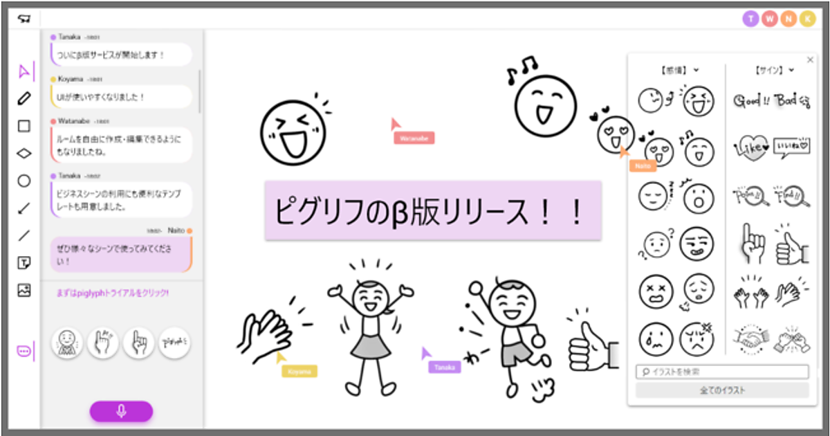 piglyph β版は、発言をリアルタイムに文字とイラストに変換し、認識をそろえて対話を進めることが可能になる。対話内容が記録・蓄積され、過去の発言やイラストを切り出せるほか、ワークスペース上で発言やイラストを自由にレイアウトして対話内容をその場で直感的にまとめられる。イラストが目印になって議論を効率的に振り返ることができる。