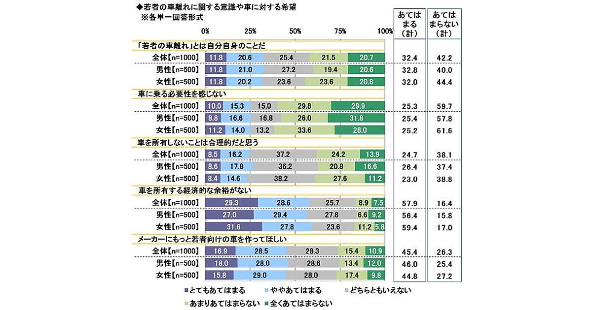 一方で、「若者の車離れとは自分自身のことだ」と思っている人は32.4%、「車に乗る必要性を感じない」人は25.3%という結果となった。また、「車を所有する経済的な余裕がない」は57.9%、「メーカーにもっと若者向けの車を作ってほしい」は45.4%であった。