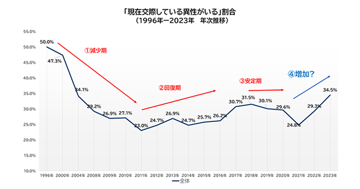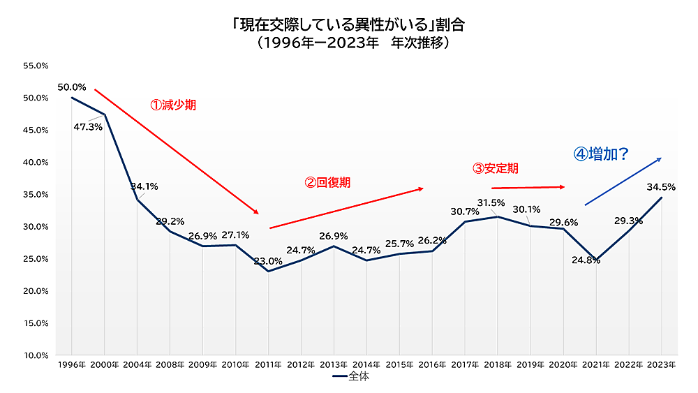 年次の推移としては、「若者の草食化や恋愛離れ」「東日本大震災をきっかけとした回復」「コロナ禍での減少」「Withコロナに応じた出会いの形」と大きく4つの流れに分かれるという。