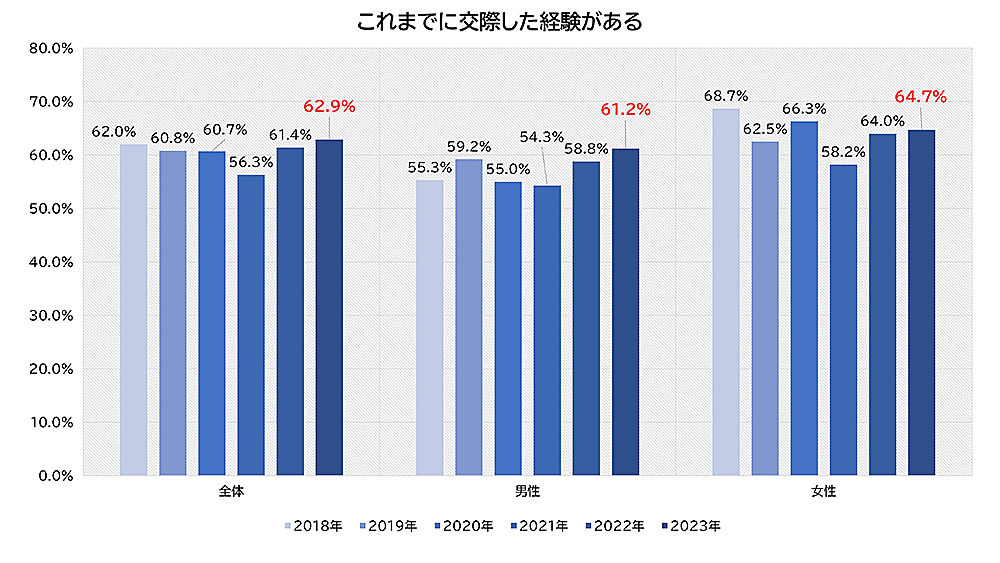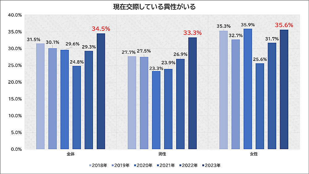 まず「これまでに交際した経験があるか?」と聞くと、62.9%が「交際経験あり」と回答し、過去7年間で最高となった(男性61.2%、女性64.7%)。また「現在交際している異性がいるか?」では34.5%が「いる」と回答。こちらも過去7年間で最高だった。男性は2016年以来初めての30%台の33.3%、女性はコロナ前の2018年に並ぶ35.6%まで回復している。