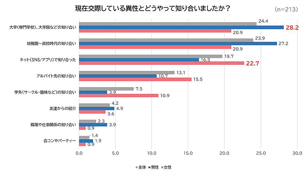 交際相手がいると回答した男女213人に「相手とどうやって知り合ったか」を聞くと、「大学(専門学校)、大学院などの知り合い」24.4%、「幼稚園~高校時代の知り合い」23.9%、「ネット(SNS・アプリ)で知り合った」19.7%が上位。「ネット(SNS・アプリ)で知り合った」は、男女を合わせた場合2020年(10.1%)の倍近くまで増加している。また女性に限ると「ネット(SNS・アプリ)で知り合った」22.7%は1位となっている。